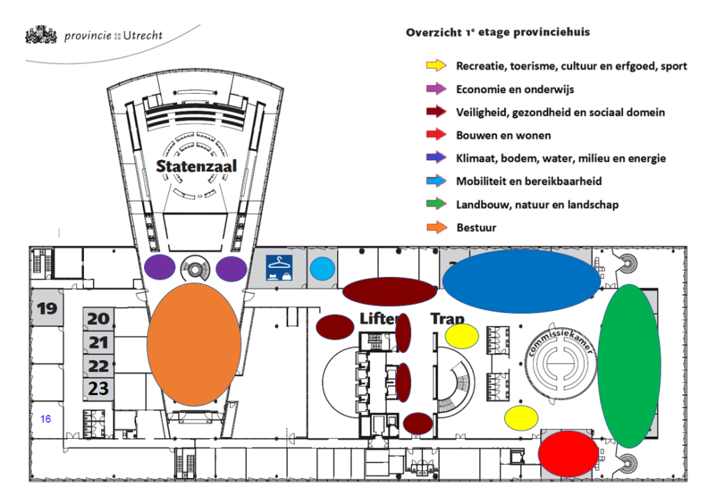 De deelnemers aan de Informatiemarkt 2026 zijn ingedeeld naar thema. Elk thema heeft zijn eigen kleur en ook een eigen plek op de eerste verdieping van het provinciehuis. Raadpleeg onderstaande plattegrond om het thema van uw keuze te vinden.