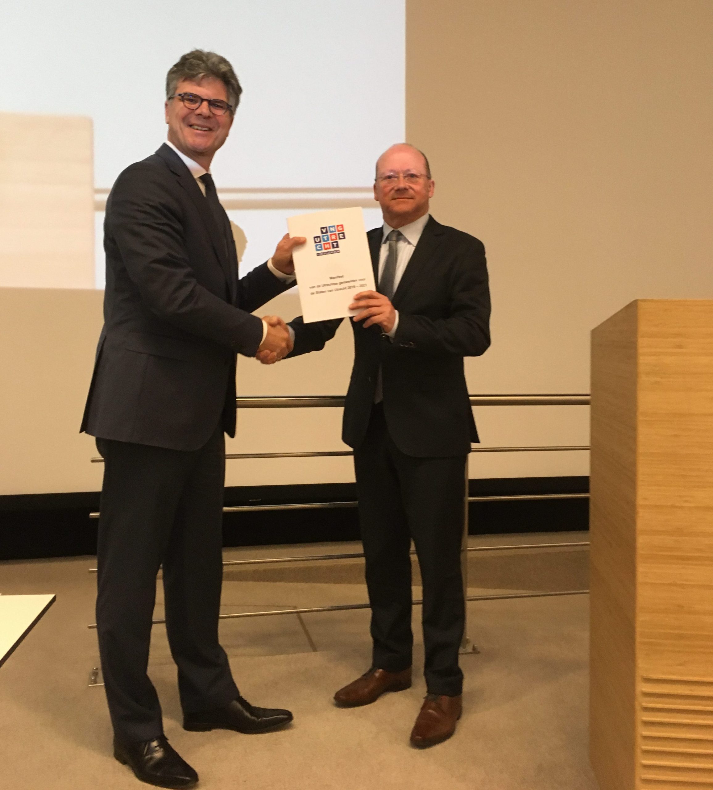 CvdK Hans Oosters (links) ontvangt het Manifest van de Utrechtse gemeenten van voorzitter Maarten Divendal.